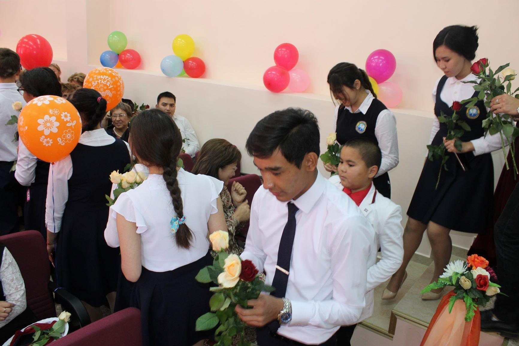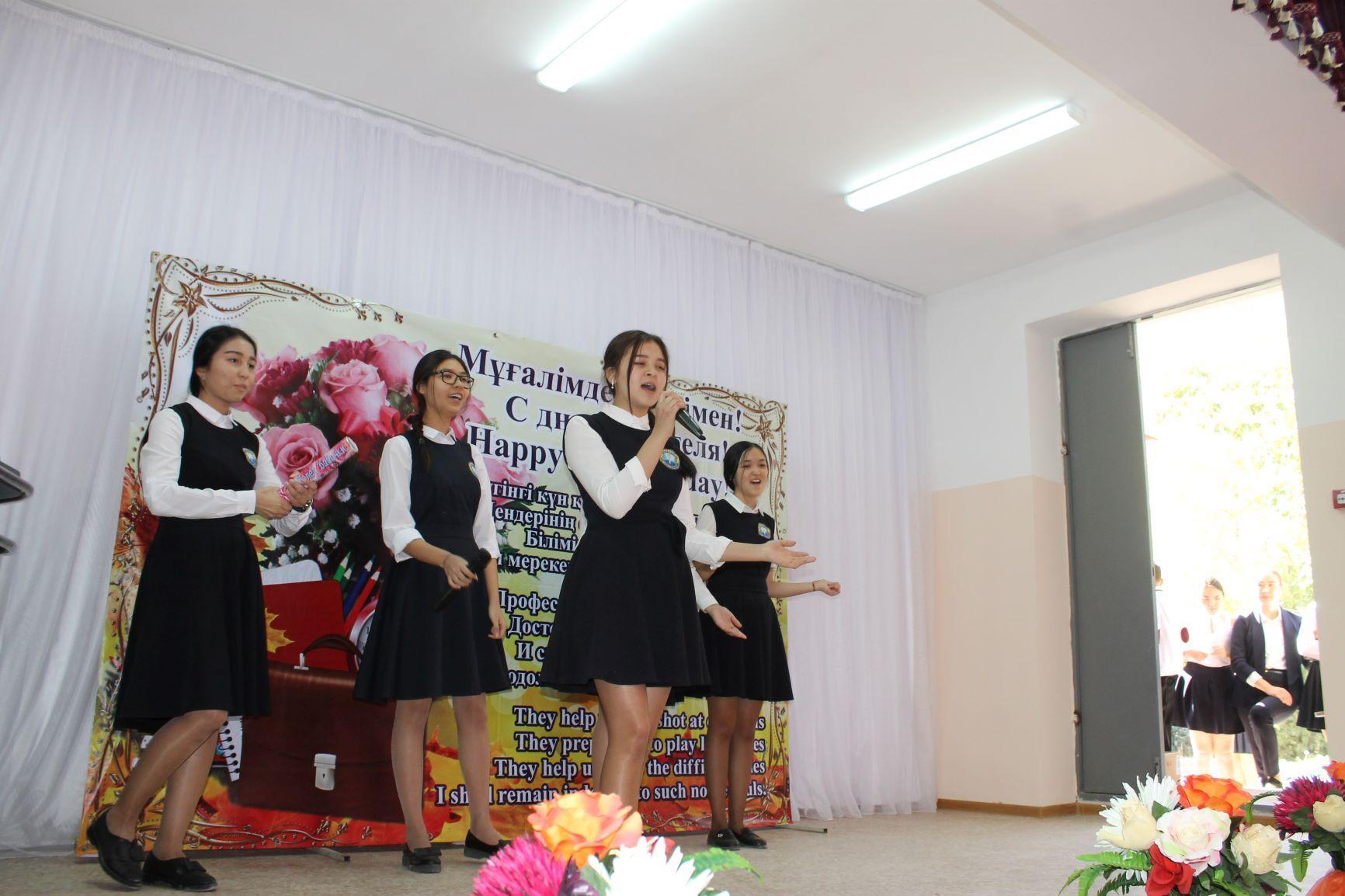 2018 жылдың 5-қазаны Ұстаздар күніне орай гимназиямызда мереке жоғары деңгейде аталып өтілді. Мерекеге іс-шара жоспары жасалынып 1-11 сыныптар арасында «Ұстаз-ұлы есім» тақырыбында сынып сағаттарымен басталып оқушылар ұстаздарына арнап өздерінің құттықтау сынып сағаттарын өткізді. 5-қазан күні ұстаздарды қызыл кілем арқылы 9-11 сынып оқушылары өздерінің ыстық лебіздерімен құттықтауларын білдіріп күтіп алды. Жәнеде осы күні бастауыш орта буын және 11-шы сынып оқушылары сағат 12-00 де гимназиямыздың барлық ұстаздар қауымына мерекелік концерт ұйымдастырылды. Концерт басында гимназия директоры өзінің құттықтауын жылы лебізін білдіріп ұстаз туралы өлең жолдарын арнады. Оқушылар концертте ән,би,өлең шумақтарын жолдап, концерт соңында 11-шы сынып оқушылары әр ұстазға гүл шоқтарын сыйлап, ұстаздарға саналы тәрбие мен сапалы білім беріп аман жүрулеріне тілек білдірді.