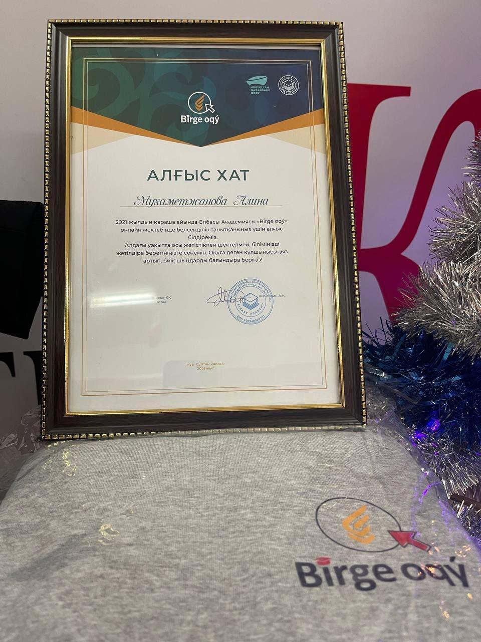 2021 жылы қараша айында Елбасы Академиясы "Birge oqu" онлайн мектебінде белсенділік танытқаны үшін Алматы облысы бойынша үш оқушыны алғыс хатпен марапаттады. Біздің 8 «Д» сынып оқушысы Мухаметжанова Алина сол оқушылардың қатарына енді. Құттықтаймыз!