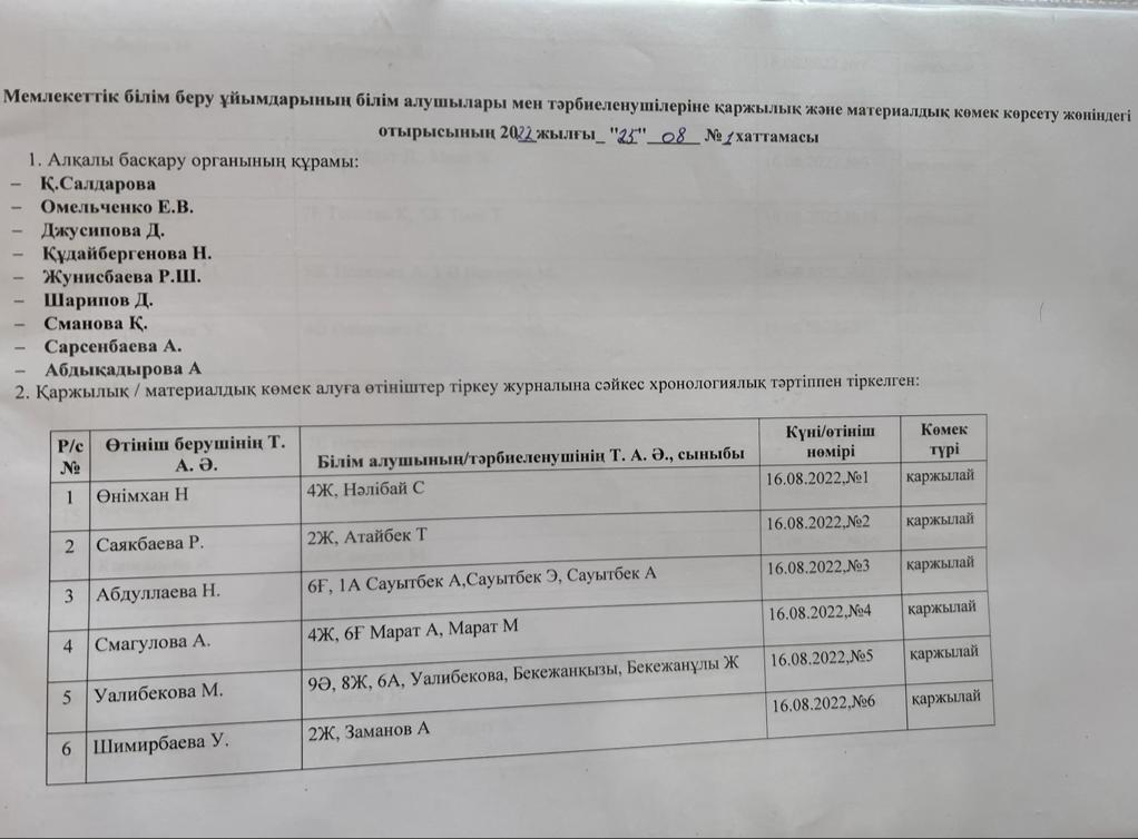 Қамқоршылық кеңес №1 хаттамасы » Алматы облысы Қарасай ауданы Алмалыбақ ауылындағы орта мектеп-гимназиясы
